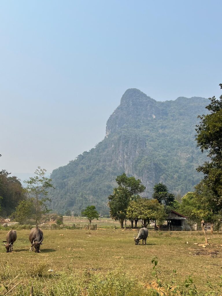 Prossima tappa Vang Vieng, raggiungete questa destinazione in treno, le ferrovie laotiane sono nuove e molto efficienti. Appena arrivati dovrete innanzi tutto cercare di non cadere dentro a un buco nel marciapiede, io ho visitato questa città nel 2025 e si presentava sostanzialmente come un grande cantiere… prendetevi qualche minuto per approfondire la storia di Vang Vieng in modo da capire meglio dove siete finiti. Perché ve lo chiederete di sicuro. Consiglio di noleggiare un motorino solo a chi lo destreggia con sicurezza e coraggio, le strade sono spesso in condizioni pessime, ma per dare un senso alla tappa bisogna necessariamente avere un mezzo per uscire dalla città. Scivolate dolcemente tra i campi coltivati osservando le casette dei tranquilli villaggi, arrampicatevi con attenzione su uno dei tanti costoni di roccia calcarea che fiancheggiano la strada, arrivati in cima poterete ammirare un paesaggio che vi lascerà senza fiato. Una valle sconfinata punteggiata di rilievi carsici vi farà emozionare al punto di non voler più tornare in città.